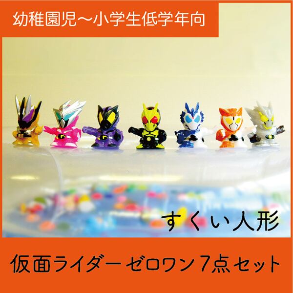 縁日やイベントでないと、なかなか手に入らないキャラクターすくい人形。現在放送中の「仮面ライダーゼロワン」の7点セットです。