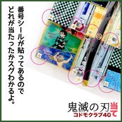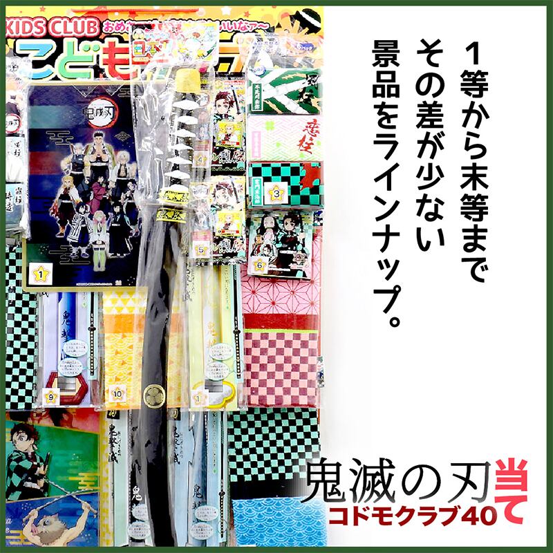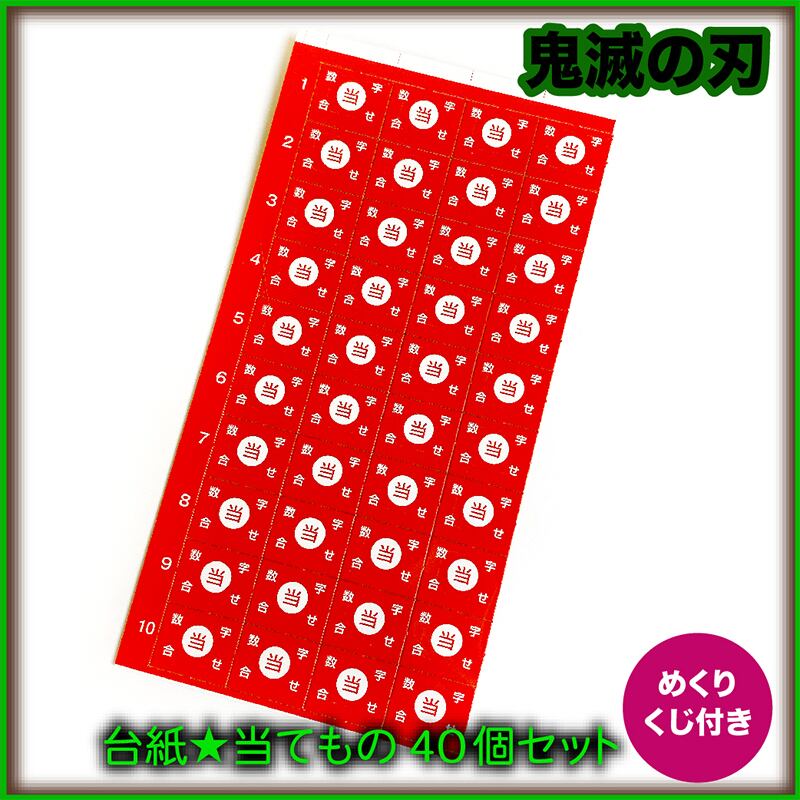 台紙に景品がついた当てくじに「鬼滅の刃」が登場!鬼滅の刃アイテムをはじめ、和柄アイテム・「鬼滅の刃」とは関係のないアイテムも含む40個付きで、くじ券付きです。景品には1~40の番号シールがはっているので、スクにくじびきあそびができます。当たりはずれの差(景品の金額差)が少ないタイプとなっております。「おうち縁日」ではもちろん、ホームパーティや屋外活動のレクレーション、小規模イベント、飲食店などの販促に♪