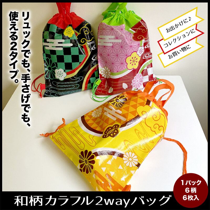 人気の和柄の2WAYバッグ(手提げにもリュックにもなります)です。6柄各1個ずつ計6個セットとなっております。学校などの体操服などを入れるも良し、エコバッグ代わりやラッピングにもいかがですか!?