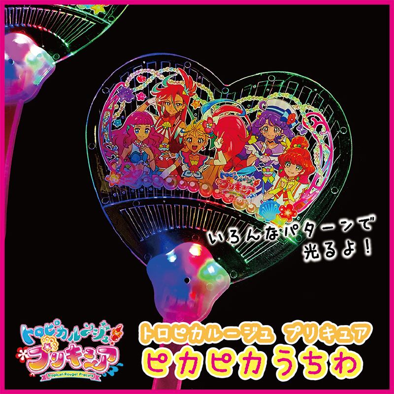 現在好評OA中!「トロピカルージュプリキュア」の光るうちわが大特価で登場!スイッチをおすと、赤・青・緑のライトが点灯したり点滅したりします。そのパターン、なんと7種類!夜の屋外で使うと目立つこと間違いナシ!花火・キャンプのおともに!おまつり・イベントに!景品にもピッタリの価格帯ですよ♪