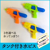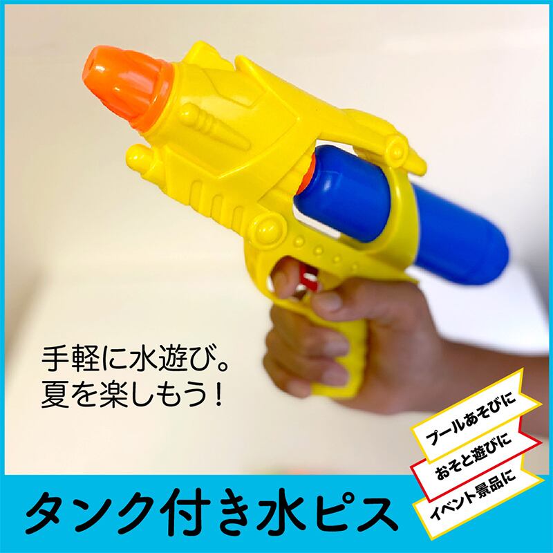 大きめのタンクのついた水鉄砲です。タンクに水を入れて引き金を数回引くと発射します。水あそびやお風呂、外遊びにいかがですか!?お手頃価格なので、イベントなどの景品にもピッタリですよ。