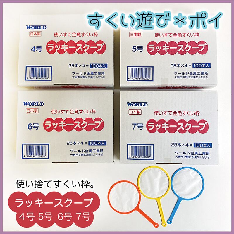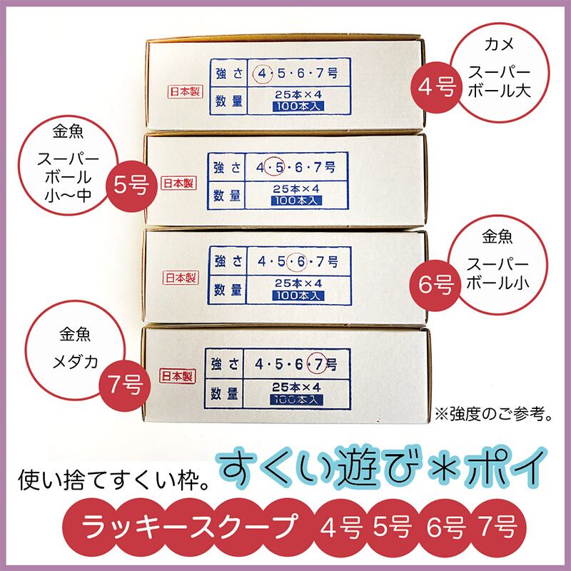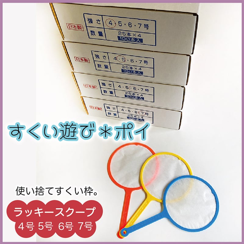 すくいあそびでおなじみの「ポイ」。たくさんの人数やおまつり・イベントならこの100個入がオススメです。枠の色は3色アソート(オレンジ25個・青25個・黄色25個)。紙の強度は4段階ございます。(数値が少ないほど強度が増します。)